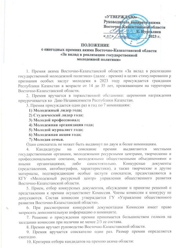 14 қараша 2023 0 1 2 3 4 5 Положение "За вклад в реализацию государственной молодежной политики" premija-polozhenie-kaz.pdf [1,81 Mb] (cкачиваний: 7) Посмотреть онлайн файл: premija-polozhenie-kaz.pdf premija-polozhenie-rus.pdf [1,79 Mb] (cкачиваний: 7) Посмотреть онлайн файл: premija-polozhenie-rus.pdf